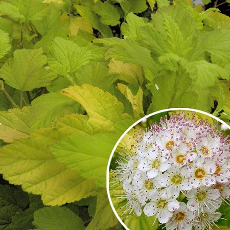 Очень эффектный сорт пузыреплодника. Высота 1,5-1,8 м. Побеги прямостоячие, слегка поникающие. Листва очень красивого ярко-желтого цвета, осенью бронзовая. Небольшие белые цветки собраны в щитковидное соцветие. Время цветения: начало июня.