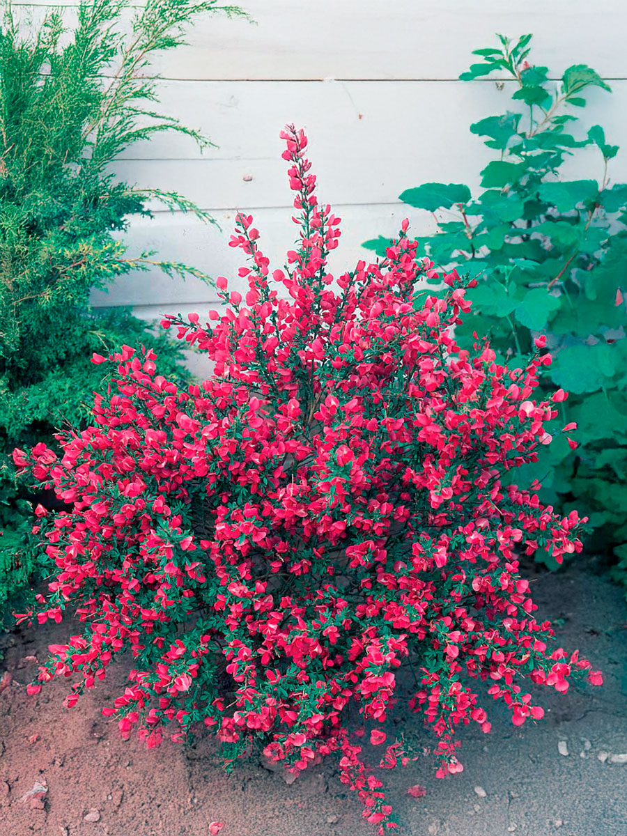 Ракитник — эффектный декоративный кустарник, который ценится за обильное и продолжительное цветение. Весной и в начале лета он покрывается яркими жёлтыми, розовыми или пурпурными цветками, превращаясь в настоящий живой фонтан цвета. Благодаря компактной форме кроны и высокой декоративности ракитник часто используют для создания бордюров, живых изгородей, садовых композиций и альпийских горок.