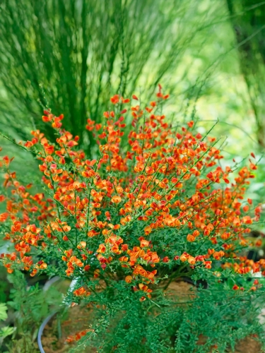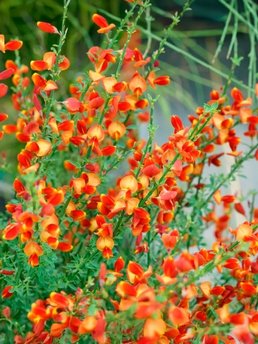 Компактный декоративный кустарник с обильным весенним цветением и эффектными двухцветными красно-жёлтыми цветками, напоминающими языки пламени. Формирует плотный, округлый куст высотой до 1,5 м и шириной до 1,2 м. Побеги зелёные, прямые, создают аккуратную форму кроны. В период цветения растение полностью покрывается множеством мотыльковых цветков, создавая эффект «горящего» куста.