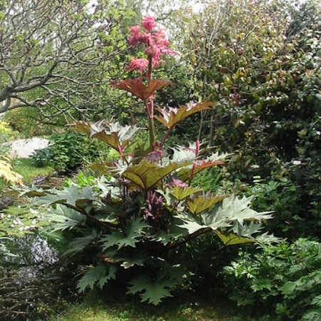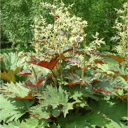 Многолетнее высокое травянистое растение, высотой 200-250 см. Стебли прямостоячие, маловетвистые. Прикорневые листья крупные, до 80 см в поперечнике, пяти-семилопастные, лопасти заостренные, крупнонадрезанные. Стеблевые листья очередные, небольшие диаметром до 10 см., с короткими черенками и круглыми пальчаторассеченными пластинками. Цветки двуполые, правильные, в многоцветковых метельчатых соцветиях. Околоцветник простой, венчиковидный, шестираздельный, беловато-розовый или красный. Цветет в июле. Название латинское: Rheum Tanguticum Особенности выращивания и ухода: Морозоустойчив, переносит морозы до 30 градусов. Любит влагу, но её переизбыток весной может привести к загниванию корневищ и почек. Не желательно сажать на участках в высоким залеганием грунтовых вод. Не требователен к свету, но в тени растёт медленнее. Нуждается в плодородной и удобренной почве Использование: Используется для создания цветнков. Может использоваться как эффектное солитерное растение. Корни и клубни используются в лекарственных целях. Молодые сочные черешки и листья используются в пищу.