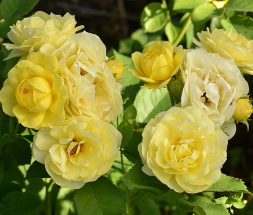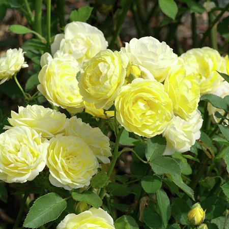 Лимонно-желтые цветки с мягким ароматом, средне-махровые (26-40 лепестков), мелкие, чашевидные, в небольших кистях. Цветут в течение всего сезона. Бесшипная (или почти), куст вертикальный с ярко-зеленой, глянцевой листвой.