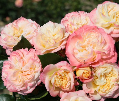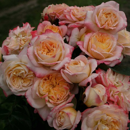 Очень красивая флорибунда необычной окраски, словно раскрашенная вручную, к сожалению мало распространенная вне Франции. Цветки украшают штрихи темно-розового цвета на нежном сливочно-розовом фоне. Изнанка лепестков почти белая, как и нераспустившиеся бутоны. Цветки распустившись, плоские, появляются в кистях по 5-15 шт. Листва темно-зеленая, побеги колючие.