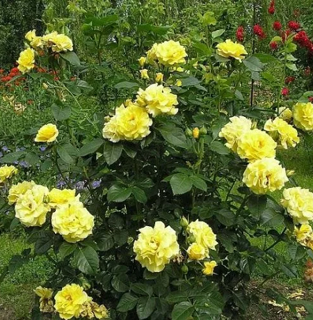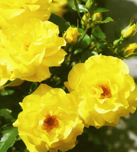 Цветки красивого ярко-желтого цвета, с более темной оборотной стороной лепестков. Они лишь слегка выгорают и держат красивую форму на всех стадиях роспуска. Красные тычинки полностью раскрывшегося цветка смотрятся очень привлекательно. Ароматные цветки появляются по одному или в кистях по 3-7 шт, долго держатся. Куст компактный, устойчивый к заболеваниям, с темно-зеленой, блестящей листвой. Цветет практически непрерывно. Хорошо себя чувствует как в жаркую, так и в холодную погоду, и хорошо держит дождь.