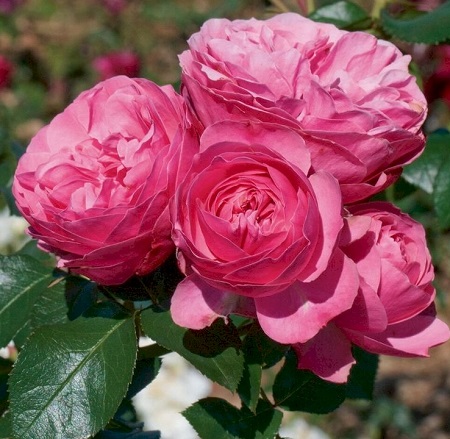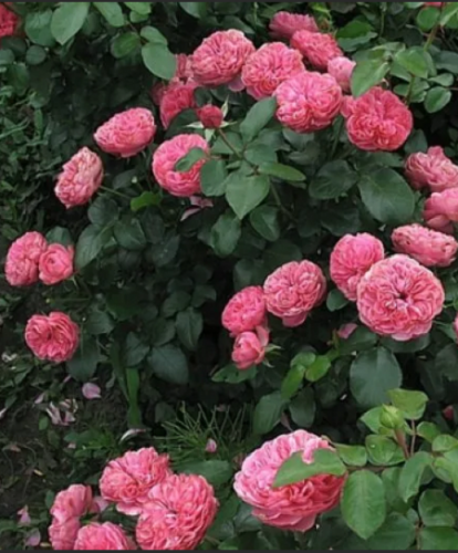 Насыщенно-розовые густо-махровые цветки, в центре квартированные, лиcтва обильная, кожистая. Куст прямостоячий, кустистый, очень компактный. Цветет обильно и продолжительно, не боится дождей, не выгорает. Выдающийся сорт.