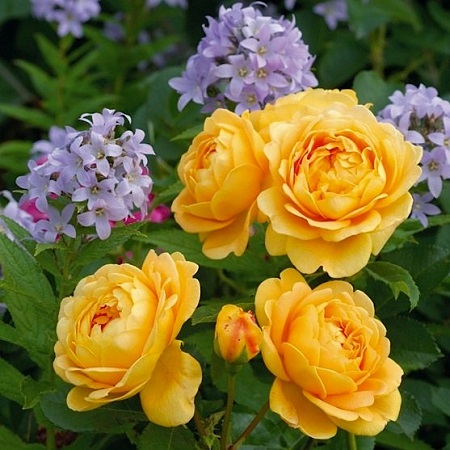 Великолепные цветки этой изумительной английской розы сочетают старинную форму с вполне современной окраской. Желтые с красным бутоны распускаются в густомахровые цветки 8-14 см в диаметре, с внутренними лепестками, образующими чашевидную форму, и отогнутыми внешними. Цвет обычно насыщенно яично-желтый, но могут появляться и персиковые или розовые тона, создавая медно-желтый оттенок. Цветки появляются в небольших кистях, часто поникают. Аромат легкий или средний, его описывают как пряный или фруктовый. Обильно цветет ранним летом, затем следуют быстро повторяющиеся волны повторного цветения до конца сезона. Побеги слегка или умеренно колючие, дуговидные, с блестящей ярко-зеленой листвой. Куст округлый, раскидистый, достигает 120-150 см высотой и столько же шириной в самом холодном климате, и до 180-200 см в жарких странах. Эта красивая роза будет хороша в миксбордере – попробуйте скомбинировать ее с лавандой или шалфеем. Устойчивость к болезням хорошая