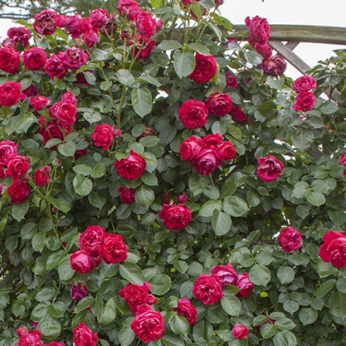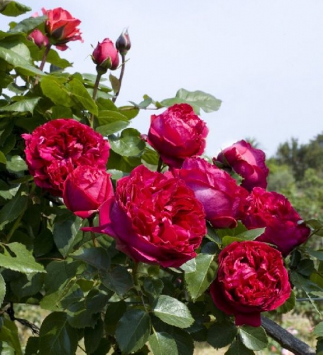 Сильный шраб или невысокая плетистая роза с густомахровыми цветками ностальгической формы. Цветки малиновые, в кистях по 3-5 шт. Аромат сильный, фруктовый. Куст ветвистый, прямостоячий, до 1,5м.
