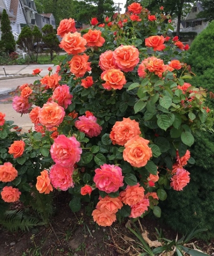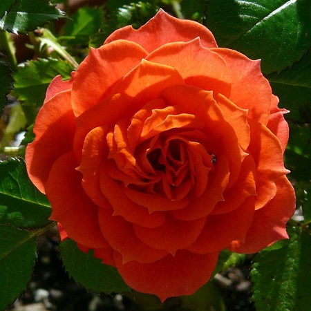 Яркие, оранжево-красные, густо-махровые цветки по форме напоминающие георгины, с 12-15 не полностью развитыми лепестками в центре бутона. Аромат тонкий, еле уловимый. Отцветают чисто. Листва темно зеленая, с 3-5-7 листовками плотной структуры.