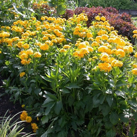 Плотная куртина высотой 50-70см, цветок крупный, золотисто-жёлтый, очень яркий, нарядный, густомахровый, с множеством продолговатых лепестков. Цветение сверхобильное и очень продолжительное ( не даром перевод сорта – золотой источник) с конца июня по октябрь. Листья плотные, зелёные, блестящие.