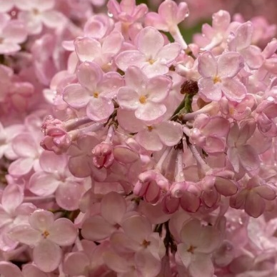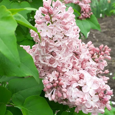 Кустарник среднего размера, раскидистый, средней густоты. Цветоносы прочные. Соцветия крупные, размером 22-25 х 20-23 см, состоят из 3-5 пар широкопирамидальных метелок, плотные. Среднее количество цветков в соцветиях 1100-1550 шт. Бутоны темно-розовые с шоколадным оттенком, иногда зеленоватые на вершине. Цветки крупные, диаметром 2,7-3,0 см, немахровые, нежно-розовые с палевым оттенком (отгибы венчика более светлые по краям), с нижней стороны с жемчужным отливом. Аромат сильный. Цветение обильное