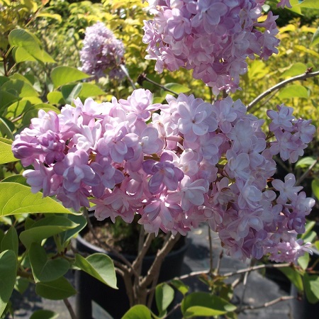 Очень красивый сорт сирени. Куст высокий, прямой. Цветки крупные, диаметром до 3 см, состоят из 2-3 венчиков розового цвета с голубовато-лиловым переливом. Соцветия большие, тяжелые, формируются из 1-2 пар очень плотных метелок. Сорт среднего срока цветения с сильным приятным ароматом.