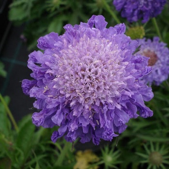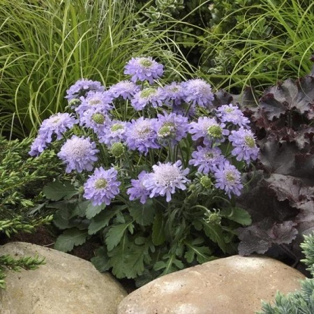 Многолетнее растение высотой 20-25 см. Прикорневые листья широколопатчатые, крупнозубчатые; стеблевые — перисто-раздельные с продолговатыми лопастями. Стебли прямые, ветвистые, бороздчатые, зеленые, редко опушенные. Одна розетка формирует 10-15 цветоносов, с нежно-голубыми цветками диаметром 4-5 см. Цветет с июля по сентябрь. Название латинское: Scabiosa Blue Note Особенности выращивания и ухода: Лучше садить на солнечных местах для более обильного цветения, но допускается и полутень. Использование: Используется для выращивания на альпийских горках, для горшков, а также оформления многолетних клумб.