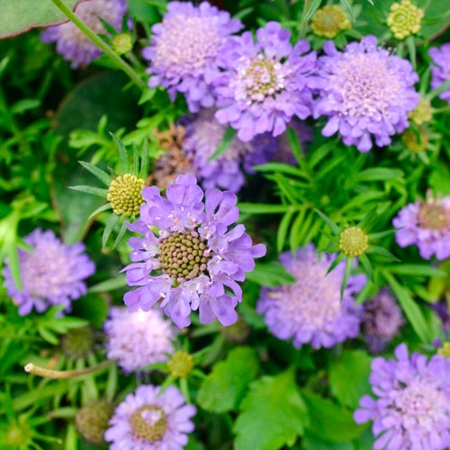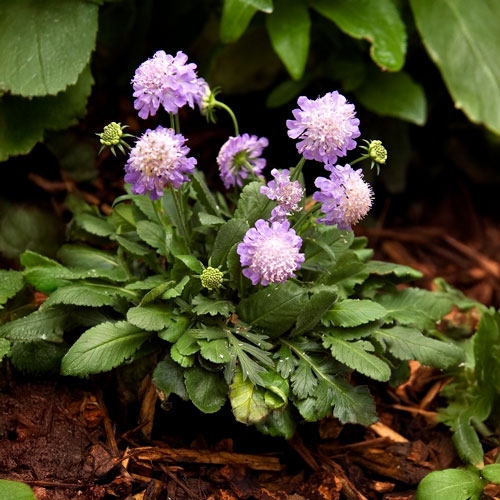 Компактный травянистый многолетник высотой 25-30 см. Образует плотные подушковидные кустики с перисто-рассечёнными сизо-зелёными листьями. Цветки насыщенно-синие (диаметр 3-4 см), махровые, с игольчатыми прицветниками, на тонких цветоносах; обильное цветение с июня по сентябрь.