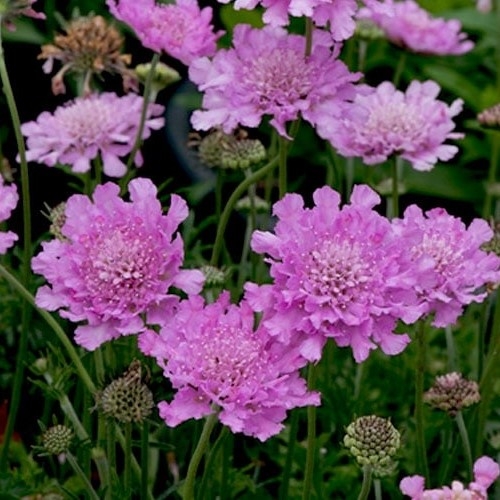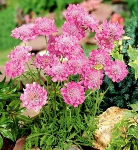 Многолетнее растение обладает кустистой и компактной формой, обильно цветёт в течение длительного времени. Его высота составляет всего 15-20 см, но несмотря на небольшой рост, цветы выглядят крупными, достигая в диаметре 5 см. Соцветия имеют лилово-розовый оттенок, они плотные, головчатые, шаровидной формы и окружены оберткой из прицветных листьев. Длинные тычинки эффектно выделяются на фоне лепестков. Листья растения зелёные, цельные, слегка опушённые, расположены супротивно. Цветение происходит в июне-июле, а повторное цветение возможно в августе-сентябре. Название латинское: Scabiosa Ritz Rose Особенности выращивания и ухода: Лучше садить на солнечных местах для более обильного цветения, но допускается и полутень. Использование: Используется для выращивания на альпийских горках, для горшков, а также оформления многолетних клумб.
