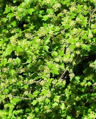 Листопадный кустарник высотой до 2,5 м с красноватыми побегами. Листья темно-зеленые, снизу бело-войлочные, трех-пятилопастые, диаметром 5-10 см.