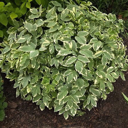 Декоративный многолетник высотой 25-30 см.Без ограничения расползается благодаря длинным подземным побегам. Поэтому обязательно выращивать с ограничением корневой системы. Листья фисташково-зеленые с белой каймой. Цветет с середины июля около двух недель белыми цветами в зонтиковидных соцветиях.