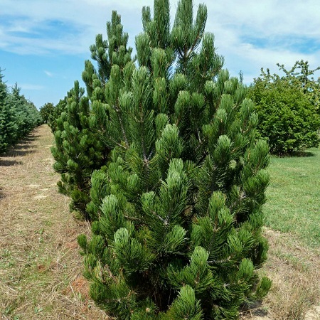Деревце карликовой формы, высотой около 3,5 метра с широкопи-рамидальной кроной. Растет медленно. Кора темно-серая, хвоя игольчатая, расположена в пучках по 2 штуки, зеленая.