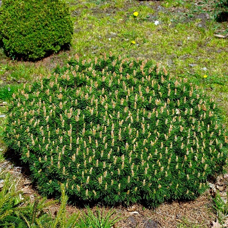 Карликовый кустарник плотной, компактной, шаровидной формы, высотой до 0.7 м и диаметром до 0.9 м. Хвоя короткая, жесткая, блестящая, иглы собраны в пучки по две. Латинское название: Pinus mugo Benjamin Особенности выращивания: Предпочитает солнечные места, растет на любых хорошо дренированных почвах, от кислых до щелочных. Морозостойка. Применение: Для каменистых садов, в качестве солитера, для групповых посадок, для создания ландшафтных композиций с другими хвойными.