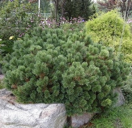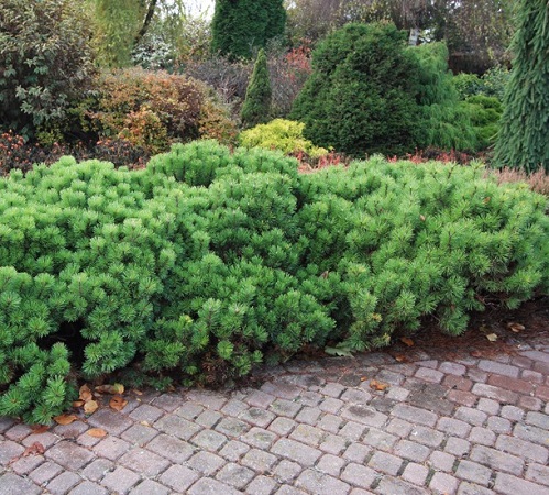 Вечнозеленый плоскоокруглый или подушковидный небольшой кустарник, с возрастом широко распростертый, с очень густо расположенными приподнятыми ветвями. Размеры-1 – 1.5 м высотой и 2 – 3 м шириной. Годовой прирост в высоту 5 см, в ширину 12 см. Хвоинки в пучках по две штуки. Бывают самой разной длины. Темно – зеленые. Ветви не ломаются под снегом. Широко – разветвленная корневая система удерживает насыпной грунт.