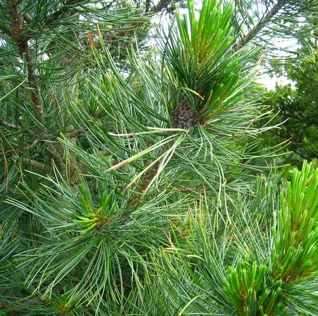 Хвоя/Листва: Длинная (5-8см), тонкая, в пучках по 5, темно-зеленая с голубоватыми устичными полосками..
