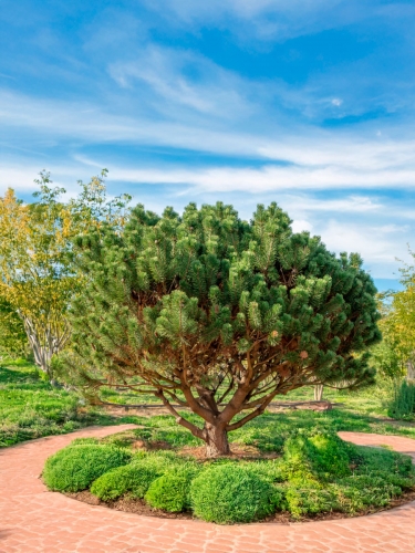 Не требует обрезки — природная форма кроны сама по себе декоративна. При посадке на солнечном месте хвоя сохраняет насыщенный цвет и плотность.