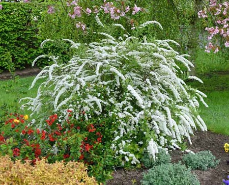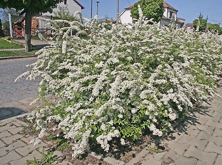 Лиственный кустарник высотой ии диаметром кроны 1,5-2 м. Листья узкие, ланцетные, расположены поочерёдно, с обоих концов заостренные, края гладкие или с несколькими зубчиками в верхней части, зеленые, с нижней стороны опушены, осенью - желтеют. Крона раскидистая, ветви свисающие. Цветки ярко-белые, до 1 см в диаметре собраны в многочисленные зонтичные соцветия, густо покрывающие побеги по всей их длине. Время цвтения: середина мая-начало июня.
