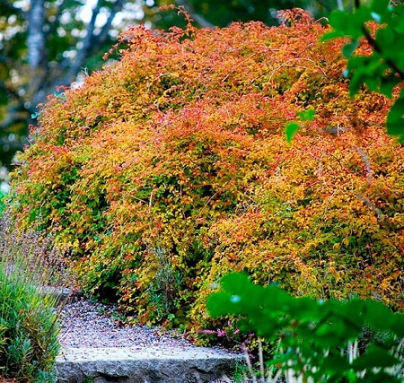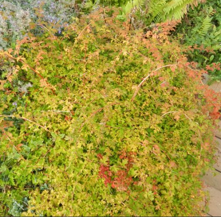 Листопадный карликовый кустарник высотой 0,5-0,8 и диаметром кроны 1,5 м. Крона гнездовидная. Побеги густые, красноватые, широкораскидистые, лежащие на земле, очень легко укореняются. Листья 3-х лопастные, с пильчатыми краями, зеленые летом и ярко- желтые осенью. Цветет в июне, мелкими белыми цветками, собранными в рыхлые метельчатые соцветия.