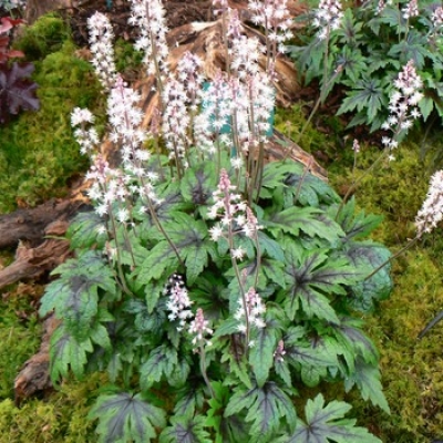 Невероятно миниатюрная тиарелла, высота 20-30см с очень резной листвой, создающей впечатление крыльев. Хорошо видна бордовая серединка. Много маленьких розовых цветочков в виде пушистых звездочек. В разгар цветения похожи на пушистые розовые палочки.
