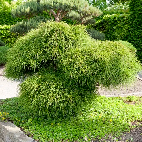 Куст имеет шарообразную форму, которая образуется благодаря нитевидным побегам. Крона куста гнездовидная, рыхлая и растрёпанная, но при этом привлекательная.