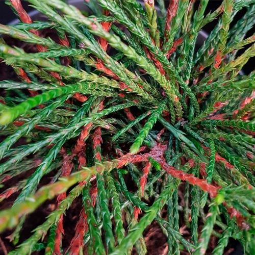 При ближайшем рассмотрении можно увидеть, что побеги покрыты хвойными чешуйками, которые наслаиваются друг на друга и создают объём, придавая побегам сходство с шероховатой бечёвкой.