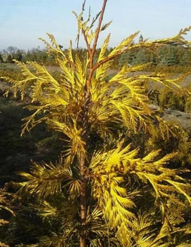 Хвойное растение из семейства кипарисовых. Через 5 лет достигает высоты около 4 м. Максимальная высота дерева – 7 м. Хвоя очень красивая, темно-зеленая с золотистым напылением. К зиме желтый оттенок усиливается. Ветви отстоящие друг от друга, концы взрослых растений слегка повислые. Шишки продолговато-овальные, 10—12 мм длиной.