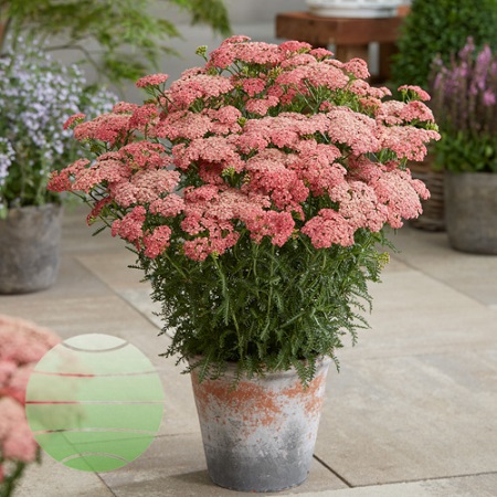 Многолетнее растение высотой 40-60 см. Куст компактный, прямостоячий, остается в вертикальном положении. Листья расположены в очередном порядке, дважды или трижды перисто-рассеченные с многочисленными ланцетовидными сегментами. Цветки от мягкого абрикосового до насыщенно-розового цвета, более яркого при полном солнечном освещении, собраны в соцветия. Цветы очень хорошо подходят для срезки. Цветение июнь-август.Один из лучших сортов тысячелистника для выращивания в контейнерах