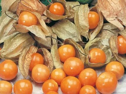 Плод физалиса - шаровидная ягода диаметром от 1,25 до 2 сантиметров, массой до 35 граммов. Кожица плода оранжево-желтого цвета, гладкая и глянцевая. Мякоть сочная, сладкая, имеет приятный виноградный привкус. Плодоносить физалис начинает уже через 2-3 месяца после посадки. Плод содержит ядовитые вещества, которые исчезают к моменту полного созревания.