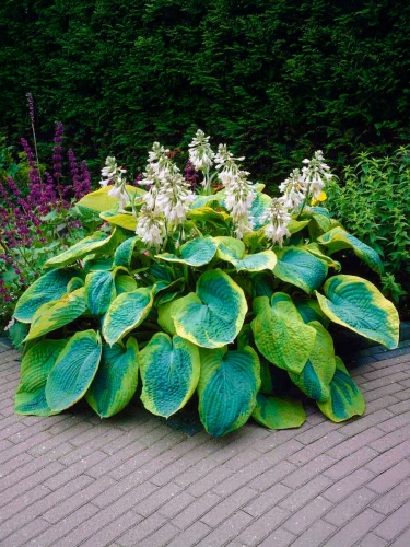 Знаменитый сорт, ставший эталоном среди пестролистных хост. Огромные сизо-голубые листья с неровной желтовато-зелёной каймой создают мощный декоративный акцент и придают композициям благородный, изысканный вид. Это одна из самых узнаваемых и уважаемых хост в мире, неизменно присутствующая в коллекциях профессиональных садоводов.