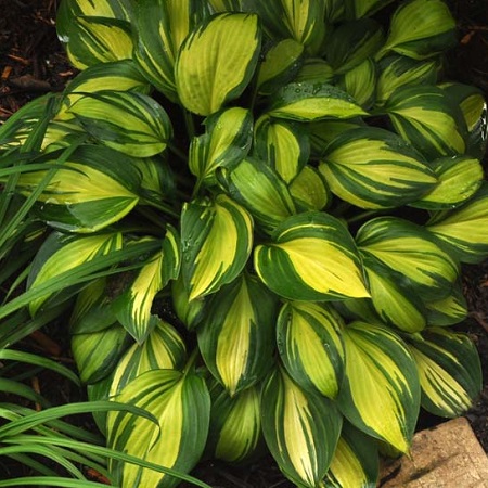 Маленькая хоста с плотными, глянцевыми, контрастно окрашенными листьями высотой до 25 см. Листовая пластинка ярко-желтого цвета с темно-зелёной широкой каймой. В начале августа появляются короткие цветоносы, на которых распускаются темно-лавандовые цветы.