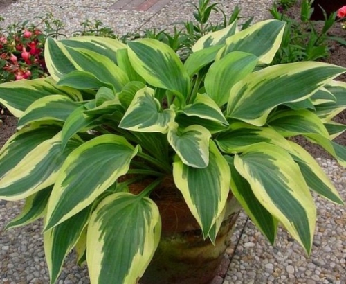 Многолетник с высотой куста 45 см. Длинные, постепенно суживающиеся сине-зеленые листья с широким, слегка волнистым золотистым краем. Светло-сиреневые цветы. Теневынослив. На одном месте могут расти более 20 лет.