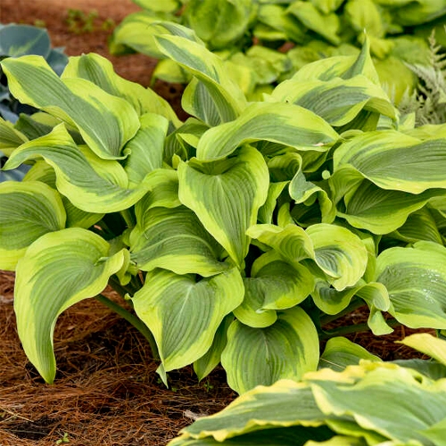 Хоста «Атлантис» имеет ярко-зелёные листья с широкой каймой от жёлтого до кремового цвета. На листьях есть небольшие полосы, которые ближе к основанию становятся более заметными. Поверхность листа матовая сверху и с сизым налётом снизу. Жилки глубокие и бороздчатые, а край листа широко-волнистый.