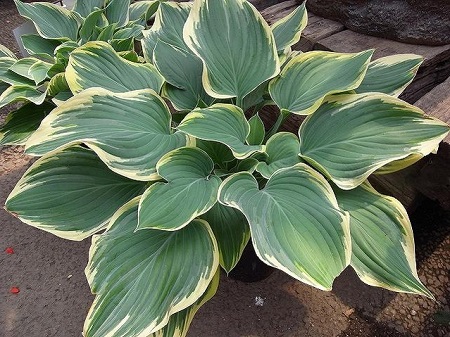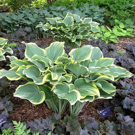 Неповторима и привлекательна размерами и формой,  изысканно красива листьями и цветами, одна из лучших больших хост.  листья крупные, плотные, широкоудленённые,  с характерным чётким жилкованием, ребристые, с волнистым краем,  сине-зелёные, как будто с  изморозью, с неравномерной,  элегантной  жёлто-кремово-белой каймой, к концу сезона центр листа меняется на серо- голубо-зелёный.