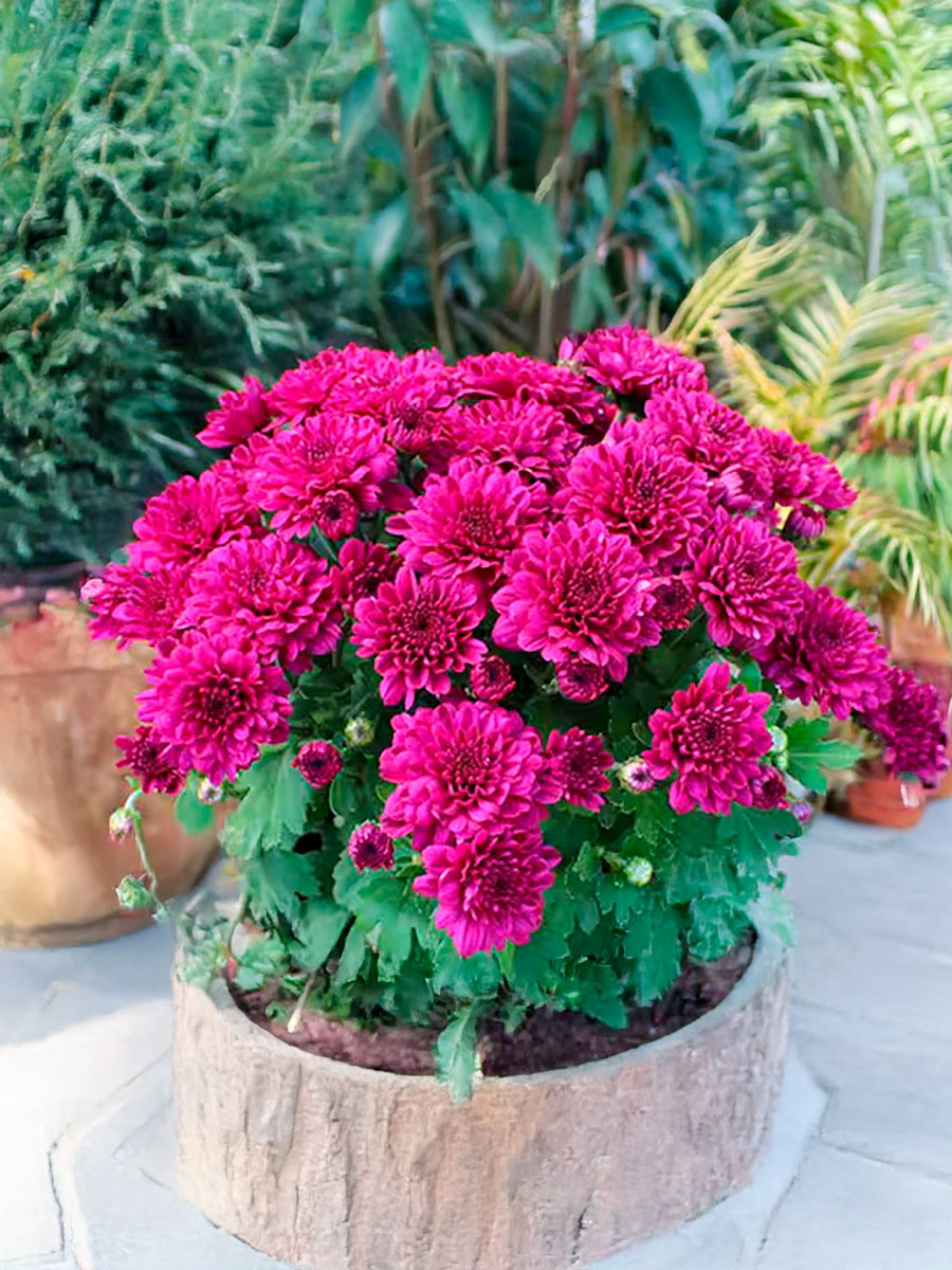 Идеальна для контейнерного озеленения, осенних акцентов и бордюров. Прекрасно сочетается с белыми, розовыми и жёлтыми сортами хризантем.