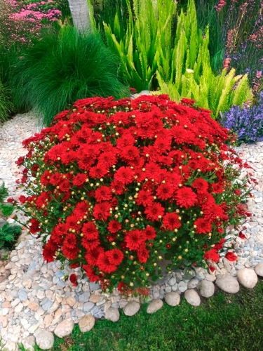 Хризантема 'Red Velvet' придаёт саду глубину и роскошь, создавая эффектные акценты насыщенного бархатного красного цвета в осенних композициях.