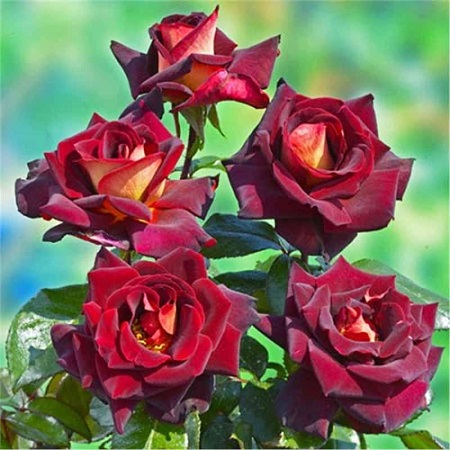 Цветки бархатисто-красные, позднее почти черные, с золотисто-желтой изнанкой. Аромат легкий или отсутствует. Цветки бокаловидные, около 10 см в диаметре, из около 30 лепестков, появляются обычно по одному. Куст ветвистый, средней высоты.