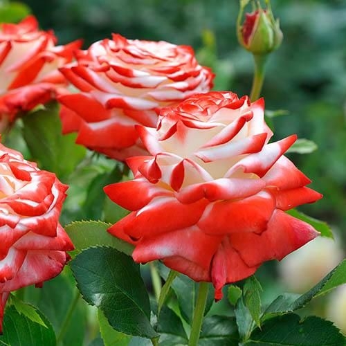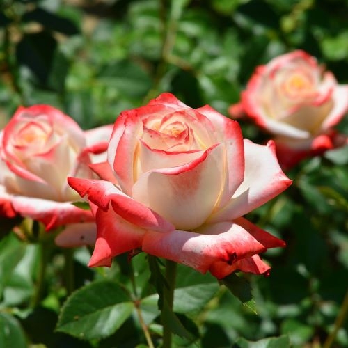 Края лепестков бледно-малиновые, лепестки закручены в классический бутон, так что наружу отгибаются только окрашенные кончики. Вначале они выглядят в основном малиновыми, но по мере распускания цветки становятся скорее белыми. Контраст между белыми лепестками и их малиновыми краями смотрится красиво на всех стадиях роспуска цветка. Цветки крупные, с длинными лепестками, появляются обычно по одному, изредка в кистях до 5 шт, на длинных побегах, превосходно подходят для срезки. Листва крупная, блестящая