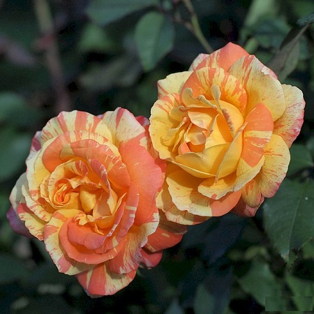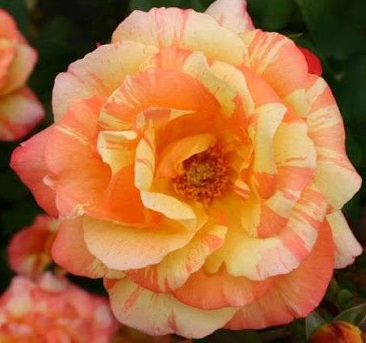 Цветки появляются по одному на длинных побегах, они ярко-желтые с оранжевыми полосками и потеками. Полоски лучше видны на внешней стороне лепестков - изнанка остается чисто-желтой. Позднее желтый цвет выгорает до кремового, а оранжевый становится малиновым, но цветок остается очень хорош. Куст мощный, прямостоячий