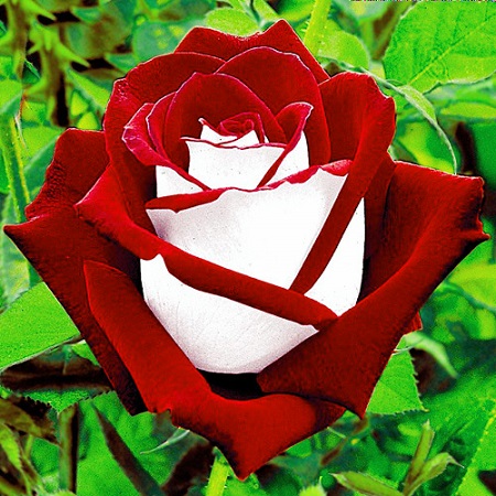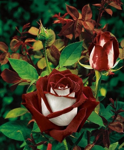 ​Цветы необычайной окраски: лепестки внутри бархатные, темно-красного цвета и снаружи серебристо-белые, с сильным ароматом. В полуроспуске - бокаловидный бутон, в полном роспуске - открытой чашевидной формы. Цветок густомахровый. Куст прямостоячий, но под тяжестью бутонов побеги могут поникать. Листва средне-зеленая, матовая.