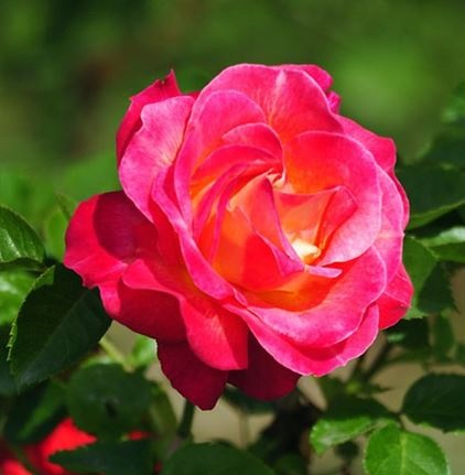 Цветок красный с серебристым бочком, махровый (среднее количество 25-40 лепестков), диаметром 10-12 см. Аромат едва уловимый. Высота куста 80-120 см. Куст прямостоячий, листва темно-зеленая, глянцевая. Цветение: повторноцветущая