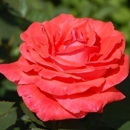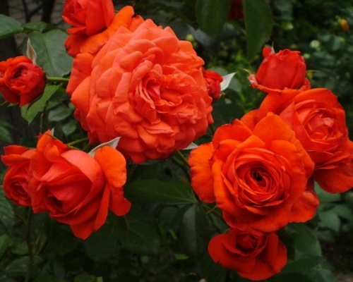 Цветок оранжевый с коралловым оттенком, чашевидный, махровый (среднее количество 25-40 лепестков), диаметром 10-12 см. Аромат слегка насыщенно фруктовый. Растение: куст 120-140 см, ширина 70 см. Куст вертикальный, со средне-зеленой, матовой листвой. Цветение повторноцветущая.