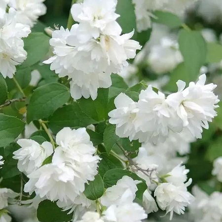 Невысокий махровый сорт чубушника. Высота до 1,5 м. Соцветия шаровидной формы, цветки белоснежные, махровые, слегка поникающие, крупные (диаметром до 7,5 см) с легким ванильным ароматом. Цветение обильное и продолжительное со второй декады июня.