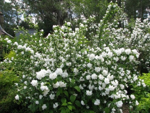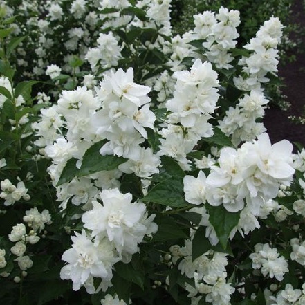 Куст шаровидной формы, густооблиственный, высотой до 3 м. Цветки 5 см в диаметре, белые, с вытянутыми изящными лепестками в серединке. Аромат нежный. Цветоносные побеги приподнятые и довольно длинные (10-16 см). На сильных ростовых побегах цветоносные побеги сидят очень густо. Время цветения конец июня-начало июля и длиться до 25 дней.