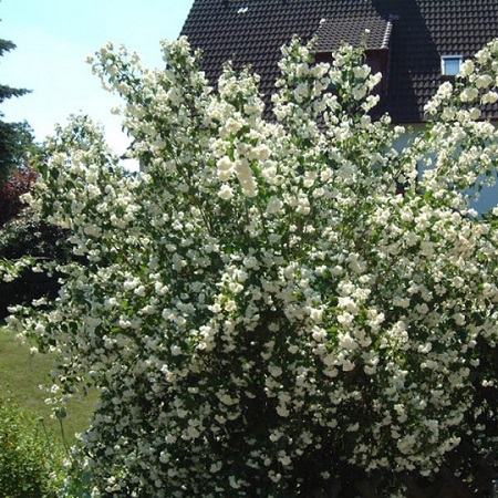 Листопадный кустарник высотой до 2 м с вертикальной кроной и сильными пряморастущими побегами. Листья черешчатые, супротивные, яйцевидно-ланцетные, крупные, темно-зеленые с сильнозазубренным краем. В цветении напоминает белоснежную вершину горы. Цветки бело-кремовые, полумахровые, диаметром 4-5 см, в кистях до 20 шт, аромат слабый. Цветёт очень обильно, с конца июня в течение месяца.