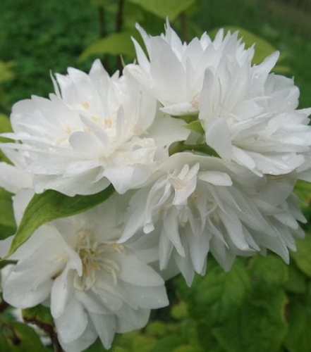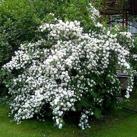Декоративный лиственный кустарник высотой до 200 см, диаметром 150 см. Соцветия шаровидной формы с 5-7 цветками, похожими на помпон. Цветки махровые, чисто-белые, диаметром до 3,5 см. с широкими внешними лепестками и узкими внутреннми, ароматные. Цветёт в июне.