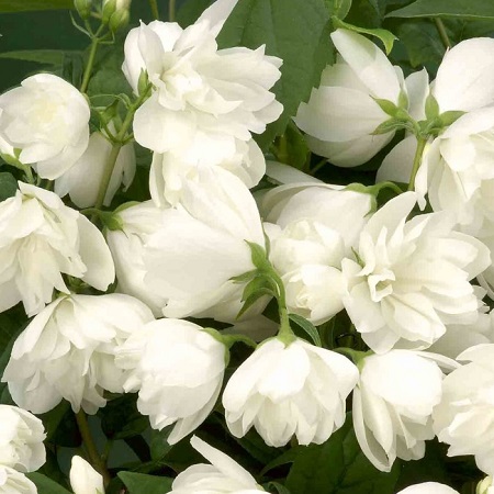 Очень популярный сорт чубушника. Высота до 2 м. Цветки махровые, чисто-белые, крупные, собраны в соцветие по 9 и более штук. Имеют очень тонкий, приятный аромат. Время цветения: конец июня-начало июля.